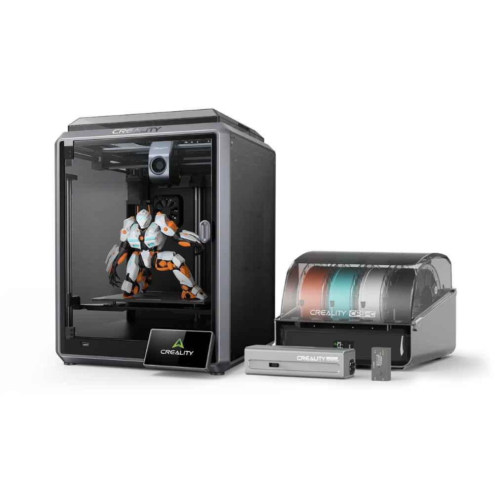 Combo paketi**, Creality’nin CFS-C çoklu filament sistemi ile donatılmıştır; bu sistem sayesinde birden fazla filament türünü aynı baskıda kullanabilirsiniz. Böylece tek renkli 3D baskıların ötesine geçip, çok renkli veya fonksiyonel parçalar oluşturmak mümkün hâle gelir. Otomatik filament algılama ve besleme sistemi, renk geçişlerini sorunsuz yönetir.