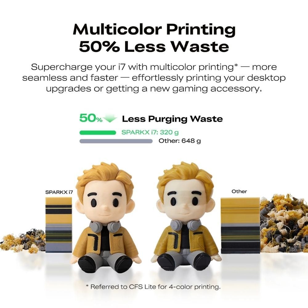 SparkX i7 Combo modeli, çoklu baskı işlemlerinizde rakiplerine kıyasla yüzde elli oranında daha az filament israf etmesiyle öne çıkıyor. Bu sayede üretim süreçlerinizde hem maliyetten tasarruf edebilir hem de çevre dostu bir yaklaşım sergileyebilirsiniz. Verimliliğinizi en üst düzeye çıkaran bu özellik ile baskılarınızı optimize edin.