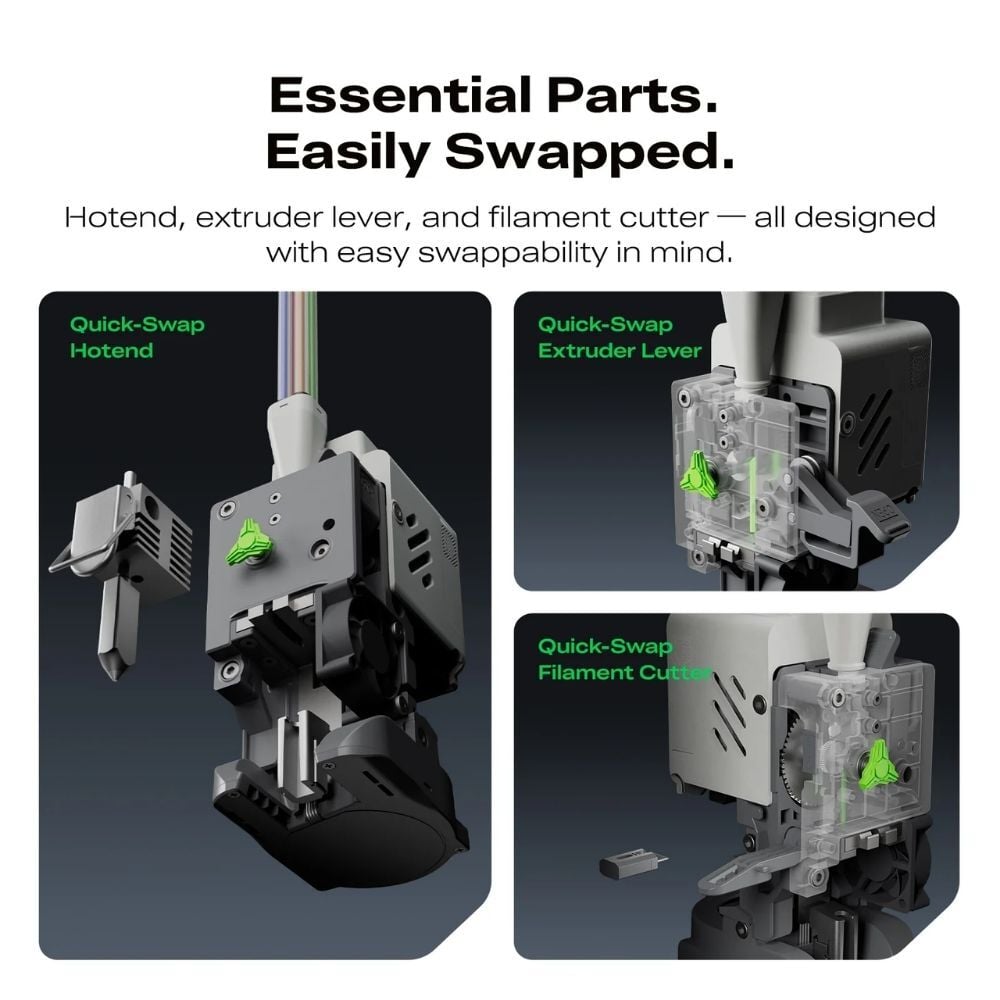 Cihazın yenilikçi Quick-Swap özelliği sayesinde bakım işlemleri artık çok pratik. İhtiyaç duyduğunuz anda Hotend, Extruder Lever ve Filament Cutter parçalarının kolay bir şekilde değiştirilebilmesine olanak tanır. Kesintisiz bir üç boyutlu baskı deneyimi sunan bu donanım yapısı, zaman kaybetmeden projelerinize odaklanmanızı kolayca sağlar.