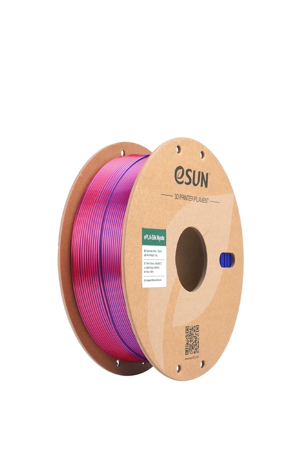 PLA SILK MYSTICK Nedir? Esun PLA SILK MYSTICK, ipeksi ve parlak yüzey dokusu ile dikkat çeken, çok renkli (multi-color) geçiş efektine sahip özel bir PLA filamentidir. Benzersiz renk geçişleriyle sanatsal ve estetik 3D baskılar üretmek isteyenler için mükemmel bir seçimdir. Yüksek kaliteli hammaddelerden üretilen bu filament, sıradan PLA filamentlerden daha parlak ve pürüzsüz bir yüzeye sahiptir. Benzersiz İpeksi ve Parlak Doku Bu filament, geleneksel PLA filamentlere kıyasla daha parlak ve ipeksi bir yüzey sunar. Pürüzsüz ve yansımalı dokusuyla, ışığın farklı açılarda yansımasını sağlayarak baskılarınızı daha çarpıcı hale getirir. Dekoratif ve sanatsal baskılar için idealdir. Çok Renkli Geçiş Efekti PLA SILK MYSTICK, kademeli renk geçişlerine sahip olmasıyla diğer filamentlerden ayrılır. Baskı sürecinde farklı renk tonlarının ortaya çıkmasını sağlayan bu filament, her baskının kendine özgü ve göz alıcı bir tasarım olmasını garanti eder. Sanatsal projeler, heykeller, figürler