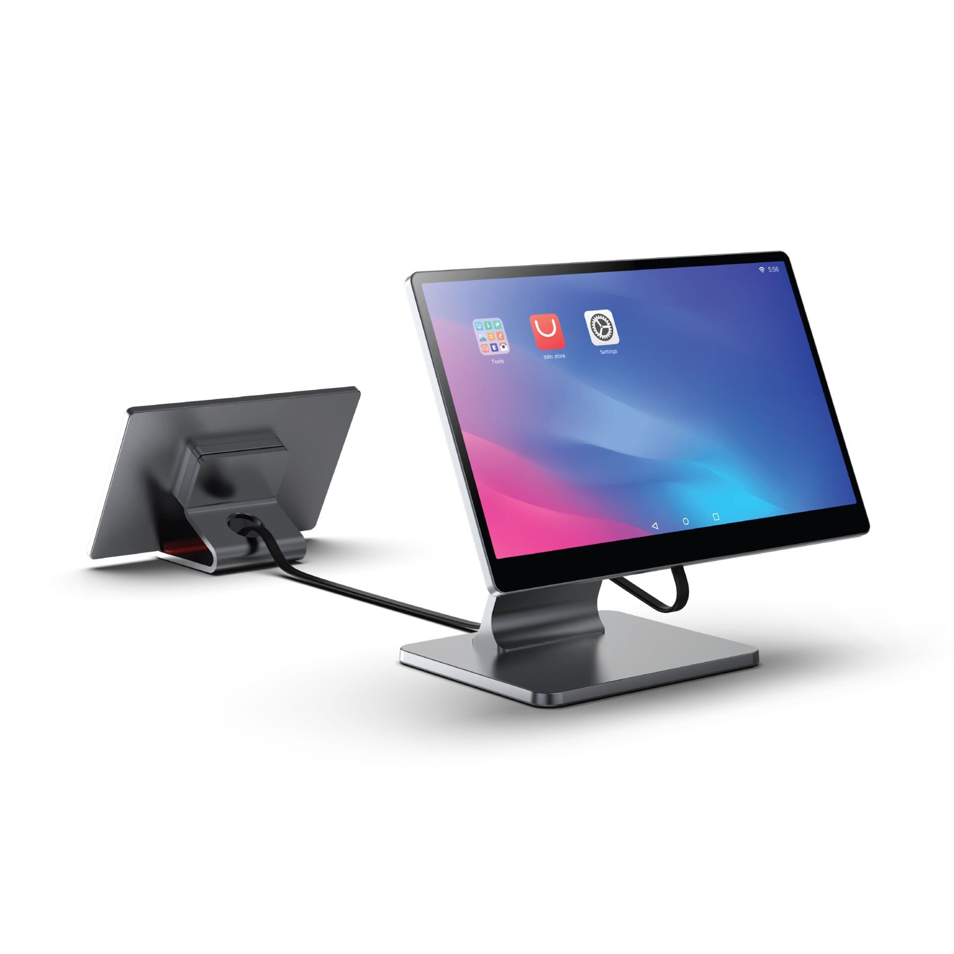 iMin Swan 1 müşteri ekranı, hem ana ekranla birlikte yan yana hem de uzatılmış şekilde kullanılabilir; bu da farklı kasa tezgâhı konfigürasyonlarında esnek kurulumlar sağlar. NFC okuyucu veya kamera gibi opsiyonel aksesuarlarla birlikte kullanıldığında müşteri etkileşimini daha da zenginleştirebilirsiniz (özellikler modele göre değişir).